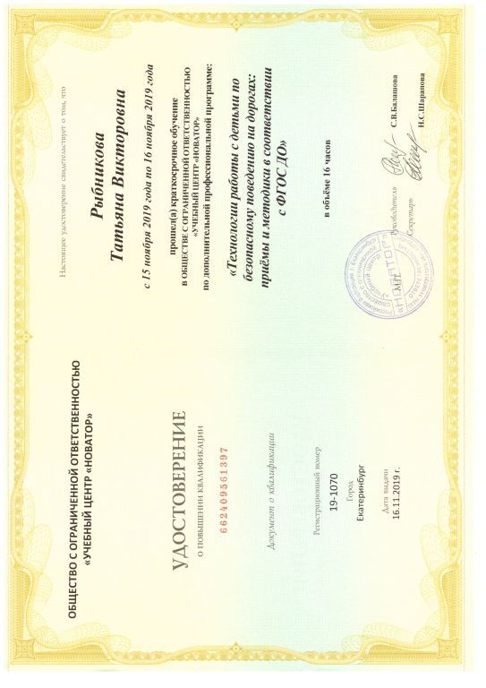 2019 - "Технологии работы с детьми по безопасному поведению на дорогах: приёмы и методики в соответствии с ФГОС ДО" в объёме 16 часов